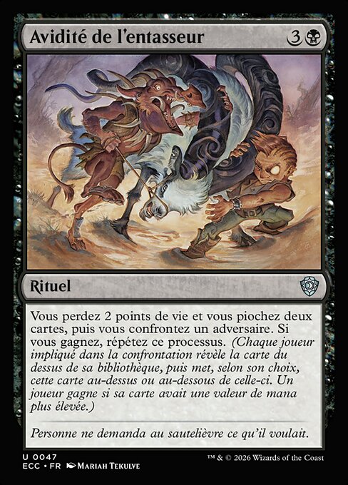 You lose 2 life and draw two cards, then clash with an opponent. If you win, repeat this process. (Each clashing player reveals the top card of their library, then puts that card on their choice of the top or bottom. A player wins if their card had a greater mana value.)