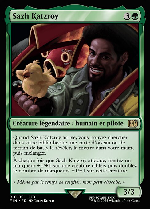 When Sazh Katzroy enters, you may search your library for a Bird or basic land card, reveal it, put it into your hand, then shuffle.