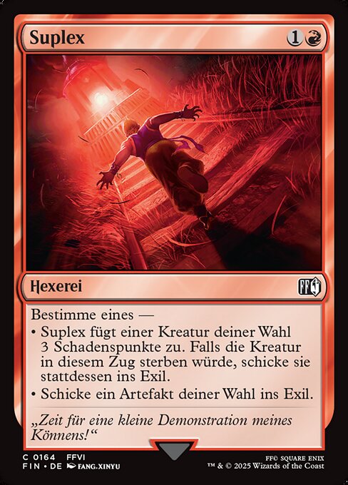 • Suplex deals 3 damage to target creature. If that creature would die this turn, exile it instead.
